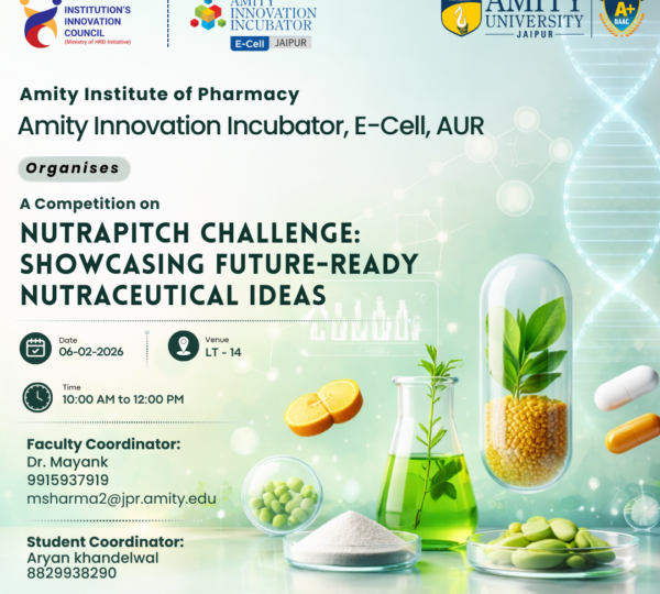The Nutra-Pitch Challenge: Showcasing Future Ready Nutraceutical Ideas, organized by the Amity Institute of Pharmacy, Amity University Rajasthan, is an innovative competition designed to encourage creativity and entrepreneurial thinking in the field of nutraceuticals. The event provides a platform for students to present novel, science-backed ideas focused on health, wellness, and preventive nutrition. Participants will pitch concepts related to functional foods, dietary supplements, herbal formulations, and innovative delivery systems that address contemporary lifestyle and healthcare challenges. The competition aims to bridge academic knowledge with industry relevance by promoting research-driven innovation and practical problem-solving.