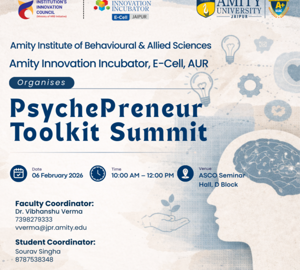 The PsychePreneur Toolkit Summit is an activity-based workshop organized by the Amity Institute of Behavioural and Allied Sciences, focusing on mental wellbeing and innovative psychological practices. The workshop is designed to equip participants with practical tools and strategies for understanding, and promoting mental health in academic, professional, and personal contexts. Through interactive activities, guided exercises, and collaborative discussions, participants will learn how to develop a mental well-being toolkit that integrates psychological insights with entrepreneurial thinking. The summit aims to enhance self-awareness, emotional resilience, problem-solving skills, and ethical responsibility while encouraging creative approaches to mental health promotion.