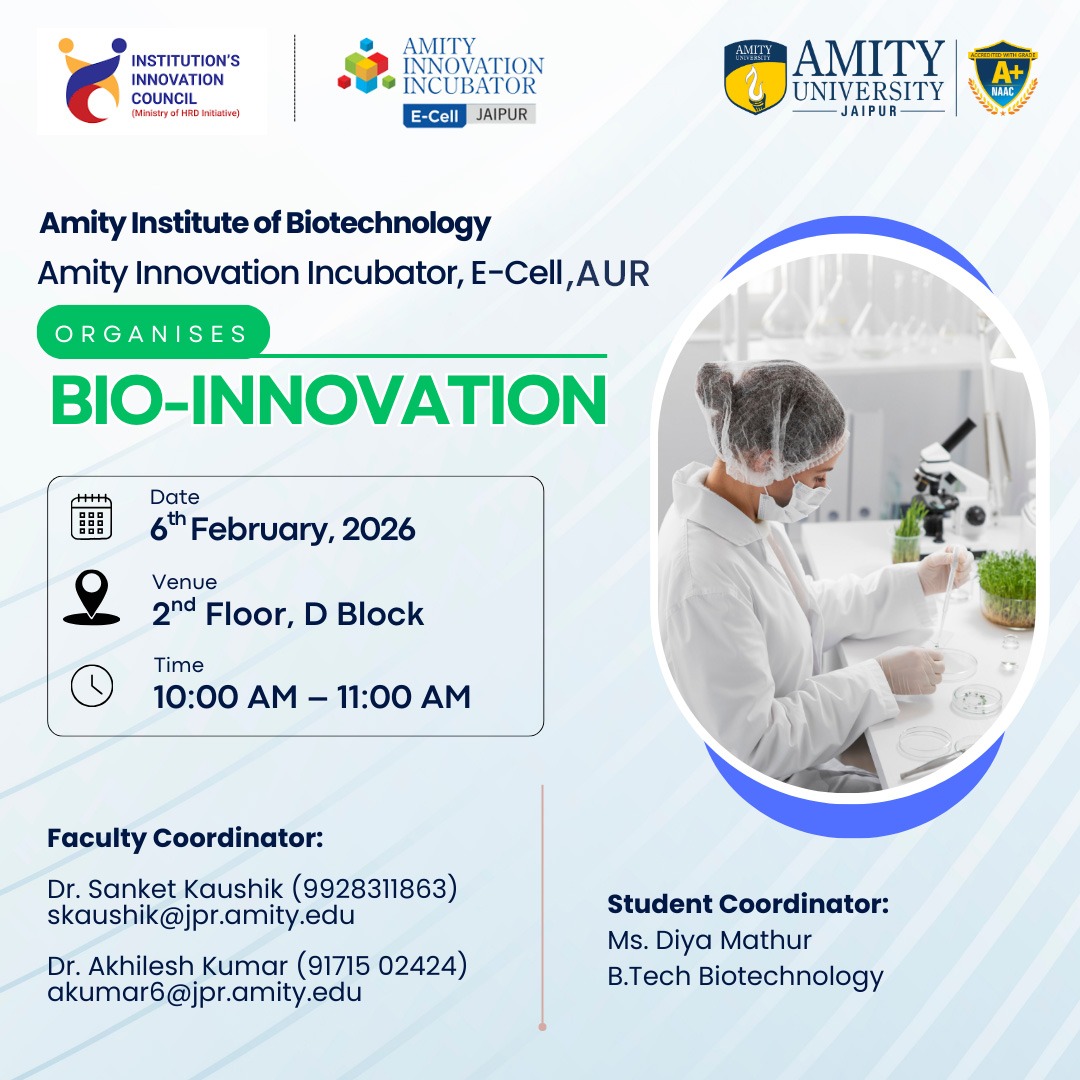 The Bio-innovation Quiz is an engaging and intellectually stimulating event organized during E-Summit 2025, taking place at Amity Institute of Biotechnology. Participants from biological sciences can take the quiz and showcase their expertise, critical thinking, and problem-solving skills across various realms of biology. The competition allows enthusiasts to test their knowledge and connect with like-minded individuals. Exploring the recent innovations, the event will attract a wide range of participants eager to explore the wonders of biological sciences. Through stimulating rounds and challenges, participants delved into topics spanning molecular biology, bioinformatics, and beyond, making the Bio-innovation quiz a memorable celebration of scientific inquiry and discovery.